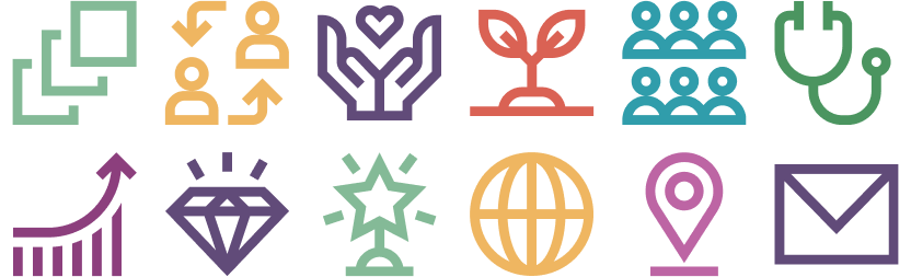 We use the secondary color palette for icons, making sure to cycle through the hues so that the order is pleasing and does not repeat in any adjacent application. When needed to make a layout more unified, choose one single color for the icons.