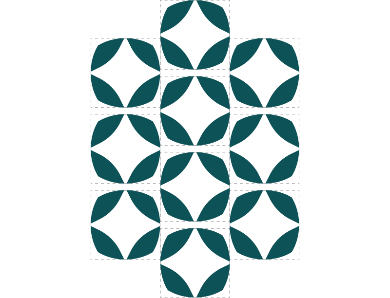 The grid spacing — three times the width of the star opening — ensures a balanced flow throughout the pattern. While the half-drop layout lends a playful sense of movement, a brick repeat is another option, offering versatility in its application.